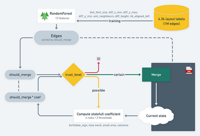 Our random forest only sees two words at the time (but some features such as nb_aligned_left give more global context). For less obvious edges (with a lower should_merge score), we make decisions based on the current state of the layout. We compute a “stateful” coefficient that multiply the should_merge score.
